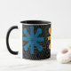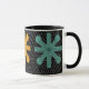 Esta taza tiene un diseño moderno de mediados del siglo XX de estallidos en colores retro en un campo de negro.