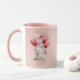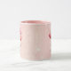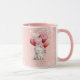 Happy Valentine's Day romantic mug with a personalized message and a cute cat illustration with heart balloons. Pink background design.