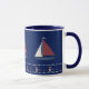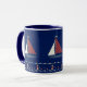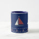 Un lindo barco de juguete azul con una vela de rayas rojas y azules flota sobre un fondo azul real.