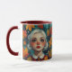 Colorful girl surrounded with fall leaves and the autumn colors. Perfect to enjoy a steamy cup of coffee or cocoa and get cozy on this fall.