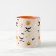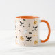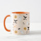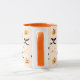 Una taza de café con fantasmas de Halloween, calabazas, telarañas y murciélagos sobre un fondo de naranja claro.
