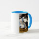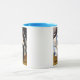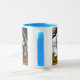 Una fotografía de un lindo gato de esmoquin blanco y negro está disfrutando de su regalo de Navidad parcialmente desenvuelto. El texto dice: "¡Navidades Meowy!" El diseño está impreso a ambos lados de las tazas. Gracias por comprar en CherylsArtPhotos en Zazzle.