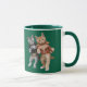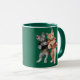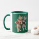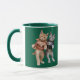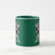 A cute funny cat coffee mug featuring an orange and grey tabby dresses in 60's attire doing the twist.