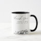 Taza de café moderna con la silueta de Portland con el texto "gracias". El diseño muestra un boceto impresionante con la capacidad de personalizar sus nombres y ubicación exacta. Ingrese a la herramienta de diseño de Zazzle para personalizaciones adicionales.