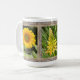 Comience bien el día con un tazón de café que contiene un mensaje inspirador y fotos de girasoles alegres y un póquer rojo caliente rodeado por un borde hecho con los patrones únicos que se encuentran en la corteza de los árboles.