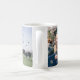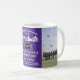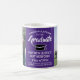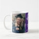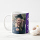 Conmemorar el logro de la graduación con esta taza de café personalizado de 2 fotos moradas y blancas. Las imágenes y todo el texto son simples de personalizar. Incluya cualquier cita inspiradora favorita, proverbio motivacional, nombre y título escolar, felicitaciones, gracias mamá y papá, u otro mensaje de su elección. El diseño incluye un gorro negro de la tabla de mortero, un nombre de tipografía moderno personalizado, un año escolar y de clase, y dos fotos de su elección, como imágenes de la ceremonia de graduación o imágenes de la ceremonia de graduación. Ofrece una idea de regalo de gran interés y una elegante adición a la decoración de la casa. ¡Felicitaciones al graduado!