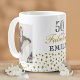 50 and Fabulous Gold Glitter Photo 50th Birthday Party Mug. The design has faux gold glitter dots and the saying 50 and fabulous is in modern script. Make your own 50th birthday mug for her. Customize with the name, age and insert your photo into the template.