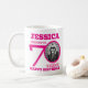Feliz 70 cumpleaños, texto rosa, nombre y dos fotos. Divertido tazón fotográfico de doble cara con el 70.º diseño de texto rosa negrita. Personalice esta taza de cumpleaños con una fotografía del chica de cumpleaños en el medio del número 0, tanto en la parte delantera como en la trasera. Excelente idea para añadir algo de diversión a la celebración de un hito de 70º cumpleaños y para mantener como un placer especial. Existen otras opciones de colores y elementos coincidentes. Diseño exclusivo de Sarah Trett para www.mylittleeden.com