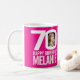 Fun 70.º tazón de cumpleaños de fotos personalizadas rosa y blanco caliente. Personalice esta taza de cumpleaños con dos de sus propias fotografías en el medio del número 0. Excelente idea para añadir algo de diversión a un hito de 70 años. Existen otros elementos y colores coincidentes. Diseño exclusivo de Sarah Trett para www.mylittleeden.com