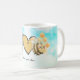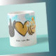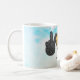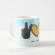 Diseño lindo con texto de "Peace Love Bees", símbolo brillante de la mano de la paz negra, corazón de doodle dorado y abeja caprichosa sobre un fondo de nubes acuarelas.