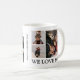 Taza de café Feliz día del padre con 6 fotos y texto que dice "ABUELO, FELIZ DÍA DEL PADRE, TE AMAMOS". Se puede editar para felices fiestas, feliz cumpleaños, feliz navidad, lo que la convierte en el regalo perfecto para cualquier familiar. La taza se personaliza fácilmente y los estilos de fuente, tamaño y colores se pueden cambiar haciendo clic en el enlace personalizar más después de personalizar.
