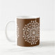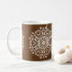 Esta mandala blanca se sienta sobre un fondo marrón oscuro. Los colores son naturales y cómodos. Parte de la colección Mola Mandala.