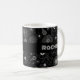 A black & white, geometric flower pattern on a mug. Use "Personalize this template" to change the "Rachel" text and name and create a unique, customized gift. A stylish mug featuring my original geometric floral pattern, with a selection of flowers including: Japanese anemones, daffodils, violets, pansies, daisies, roses, Michaelmas daisies, cinquefoils, primroses, buddleia, clematis, gardenia, phlox and forget-me-nots. The print is white with a subtle dark grey behind on a black background.