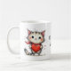 This adorable kitty cat holding a red heart wants to know "Will you be my Valentine?" There are two images, one on each side of the mug. Text is in between the images and can be changed. AI assisted graphic purchased with commercial use. Artwork: RedHeronLighthouse