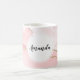 Una taza con un diseño elegante y moderno. Una acuarela rosa de color rosa con un sutil aspecto de ágata de mármol y una cinta purpurinoso dorada en medio. Un círculo en la parte superior con tu nombre dentro.