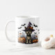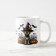 Perro lindo vistiendo al gorra de una bruja preguntando "¿Alguien dijo que traten?" Una taza humorística para Halloween. Gráfico asistido por IA adquirido con uso comercial. Pintura: RedHeronLighthouse