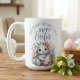 Esta dulce taza de Pascua tiene una abundancia de sutileza, con un conejo blanco muy querido que sostiene un huevo de Pascua pintado, mientras se esconde en un ramo de vegetación floral de colores pastel. El texto de arriba dice "Algunos conejitos te desean una pascua feliz" en un adorable guión decorativo violeta pastel.