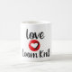 Mug para usar cuando esté sentado y Loom Knitting. "Love 2 Loom Knit" grandes letras negras y rojas con un corazón y el número 2
