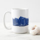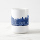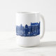 Mug con casas de canales tradicionales y botes al estilo de Delfware azul sobre un fondo blanco.