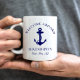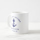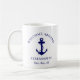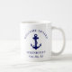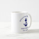 Una moderna taza de moda con temática náutica para el barco que cuenta con un ancla azul marino. Puedes personalizar el texto "Welcome Aboard" y el nombre y ubicación de tu barco en una elegante tipografía azul marino.