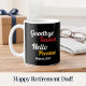 "Adiós a la tensión, Hola a la pensión, Año jubilado" Café Mug con un estilo retro de tipografía de estilo rojo y amarillo. Diseño moderno en blanco y negro.