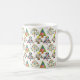 Esta taza tiene un diseño moderno de mediados de siglo de árboles navideños de diferentes estilos. Una tiene una rejilla con rectángulos con estallidos en el interior. Otro tiene rectángulos redondeados con rectángulos más pequeños dentro. Un tercio tiene líneas curvas con estrellas sobre ellas. El árbol final es un triángulo con otros triángulos más pequeños dentro