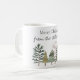 Esta taza de café de Navidades, sencilla y elegante, presenta un diseño acuático acogedor. Una imagen de un bosque invernal se coloca en el fondo, con varios árboles salpicados de nieve. Un saludo de "Feliz Navidad" está impreso encima de un ejemplo de apellido en la parte superior. Puede personalizar la taza para incluir su propio nombre o texto personalizado.