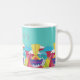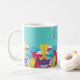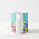 Inspirada en el diseño Art Déco, esta taza tiene un gran friso de patrón a lo largo de la parte inferior con rayos de sol abstractos, olas, círculos y nubes en brillantes tonos amarillos, rojos, rosas y azules. Puedes personalizarlo con tu nombre. La obra es un patrón original, único, dibujado a mano.