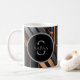 A luxurious Art Deco design featuring a bold central circle with a customizable monogram letter intersected by a personalized name. Polished copper and metallic silver geometric elements create a striking symmetrical composition against a deep matte background. The clean intersection of the letter and name adds a refined personal touch.