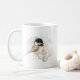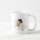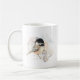 Un hermoso pájaro de garbanzos con gorras negras pintado en acuarela con flores azules pintadas por el artista Jennifer Steffen.