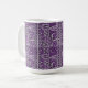 Este gráfico abstracto digitalizado, de líneas variadas, cuadrados y remolinos, se asemeja a una lavanda de peñer grabada, gris y negro, con un color vívido, morado.