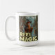 Esta imagen caprichosa muestra un mago parado al lado de un río en una zona boscosa, sosteniendo una barra de pesca con un pez flotando hacia la línea. Vestido con atuendo tradicional de mago, incluyendo una bata larga y un gorra puntiagudo, el mago lanza un hechizo mágico mientras pesca. El fondo, arbolado y montañoso, crea un ambiente místico y sereno. El texto "REEL MAGIC" que se muestra de forma destacada en la parte inferior de la imagen, añade un toque humorístico y mágico a la escena.