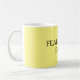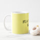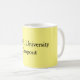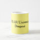 Obra clásica, 11 onzas, taza de café con cita de motivación chistosa: "TEMA la salida de la universidad" en fondo amarillo.