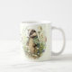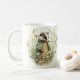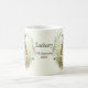 Marcador personalizado de nombre en taza con imágenes de espejo en ambos lados, nombre y fecha de nacimiento en medio de la taza.