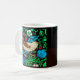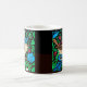 Mug en un patrón de baldosas de estilo Art Nouveau de William Morris, realzado digitalmente y coloreado, que representa a un ave de color beige y marrón suave, con flores azules vívidas, ceruleñas, hojas verdes y fresas silvestres, sobre un fondo negro
