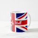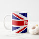 La colorida bandera azul y blanca de Union Jack del Reino Unido se muestra aquí con una graciosa jerga familiar que dice groserías, "Maldito infierno". La palabra sangrienta... es una corrupción de la sangre de Dios, una frase usada hasta el siglo XVII... el infierno fue agregado más tarde. Este lenguaje es una manera muy informal y grosera de expresar gran rabia. Puede editar este texto con cualquier otro texto de su elección, o incluso borrar el texto por completo si prefiere la taza sin él.