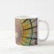 Relájate con esta taza de café de colores que muestra el magnífico tragaluz de cristal manchado en la sala de conciertos del Palau de la Música Catalana en Barcelona, España.