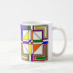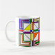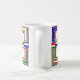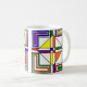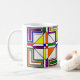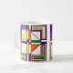 Esta taza tiene un diseño Bauhaus de líneas, triángulos, diamantes y cuadrados que hacen una apariencia de vidrio manchado en colores primarios y secundarios.