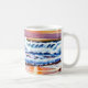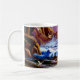 Pintura de una playa al amanecer con pequeñas olas y gaviotas volando en el colorido cielo rosa y naranja.