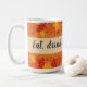 Coma, bebe y sé tazón de café vegan en colores otoñales con hojas rojas, amarillas y naranjas