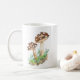 arte acuático tradicional de dos grandes setas marrones que crecen de un suelo de bosque de color verde y marrón en una taza de café.