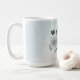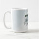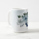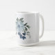 Hermosa taza de café botánico con flores blancas románticas, azul polvoriento y azul marino con hojas verdes.