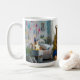 Artistic mug featuring a golden-haired girl with a jeweled crown in a soft blue royal bedroom, symbolizing innocence, creativity, and fairytale dreams.