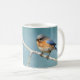 Taza blanca clásica con un diseño digital de un bluebird del este en una rama gris clara.