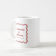 Celebra tu día especial con un toque atemporal usando esta taza de boda rojo oscuro del borde ondulado de los años 50. Con un fondo blanco resplandeciente enmarcado por un audaz borde ondulado rojo oscuro, este diseño capta la elegancia de los años 50. Los nombres de la novia y del novio y la fecha del boda se muestran con gusto en un color rojo oscuro y coordinado, añadiendo un detalle personalizado y sofisticado. Perfecto como un favor de boda, un regalo de ducha de novia o un regalo para sus invitados, esta taza de inspiración retro combina estilo y función para un toque memorable a su celebración.