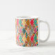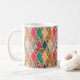 Esta taza tiene un diseño boho de diamantes con diferentes patrones alternando con diamantes sólidos en una paleta de colores boho.