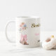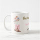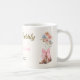 The Boots and Bubbly bridal shower coffee mug is designed with brown cowgirl boots, a pink bow, colorful flowers, pink, brown, and black text, and a tan background.