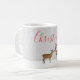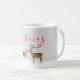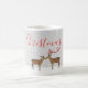 Celebra la magia de la temporada navideña con esta encantadora taza de Feliz Navidad que presenta una escena pacífica de ciervos en el bosque. El suave fondo nevado, la elegante letra en caligrafía roja y el diseño minimalista de invierno crean un aspecto acogedor y festivo perfecto para la Navidad.
