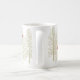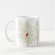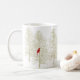 Dos pájaros rojos minúsculos se encaraman en ramas del invierno en este diseño limpio, moderno de la taza.