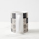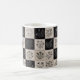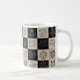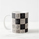 Unique coffee mug with botanical floral leather-look patchwork design. Vintage flower illustrations on stitched leather-style squares creating artisan patchwork aesthetic. Black, white, and beige rustic pattern. Perfect for nature lovers, gardeners, and rustic decor enthusiasts. Handcrafted artisan style.